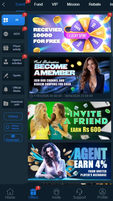 Players can invite friends and earn commissions or bonuses.